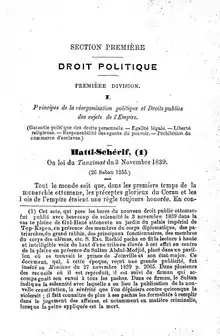 Bien que ce rescrit fût présenté à l'époque dans la presse occidentale, en France notamment, comme une constitution, il en était encore loin. La liberté de religion et de croyance n'était pas instituée d'une manière non équivoque, de même que l'égalité politique entre musulmans et non-musulmans.