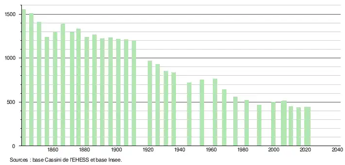 L'évolution du nombre d'habitants est connue à travers les recensements de la population effectués dans la commune depuis 1841. Pour les communes de moins de 10 000 habitants, une enquête de recensement portant sur toute la population est réalisée tous les cinq ans, les populations légales des années intermédiaires étant quant à elles estimées par interpolation ou extrapolation[24]. Pour la commune, le premier recensement exhaustif entrant dans le cadre du nouveau dispositif a été réalisé en 2005[25].