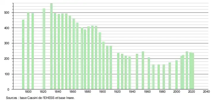 L'évolution du nombre d'habitants est connue à travers les recensements de la population effectués dans la commune depuis 1793. Pour les communes de moins de 10 000 habitants, une enquête de recensement portant sur toute la population est réalisée tous les cinq ans, les populations légales des années intermédiaires étant quant à elles estimées par interpolation ou extrapolation[18]. Pour la commune, le premier recensement exhaustif entrant dans le cadre du nouveau dispositif a été réalisé en 2008[19].