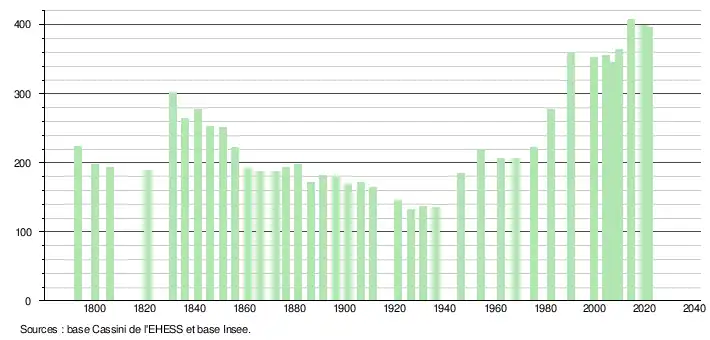 L'évolution du nombre d'habitants est connue à travers les recensements de la population effectués dans la commune depuis 1793. Pour les communes de moins de 10 000 habitants, une enquête de recensement portant sur toute la population est réalisée tous les cinq ans, les populations légales des années intermédiaires étant quant à elles estimées par interpolation ou extrapolation[19]. Pour la commune, le premier recensement exhaustif entrant dans le cadre du nouveau dispositif a été réalisé en 2004[20].