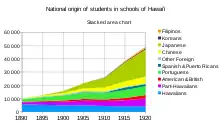 L'arrivée des Chinois est attestée dès 1778 et jusque 1900, comme premiers ouvriers agricoles dans les plantations de canne à sucre créées dans l'archipel. Comme les hommes venaient seuls, les mariages mixtes avec des natives hawaïennes ont contribué à leur intégration[12]. Ils sont rejoints par les Portugais en 1878[13], en majorité de Madère et des Açores, embauchés par la Hawaiian Sugar Planter's Association, qui recrute également parmi les Japonais à partir du sur la base d'un accord bilatéral avec l'empereur du Japon. Ce sont les Espagnols qui prennent la succession des Portugais dans les plantations de canne à sucre avec une arrivée de dizaine de milliers de personnes, adultes et enfants, entre 1907 et 1913[14]. Avant eux, l'Espagnol polyglotte, Francisco de Paula Marín, était déjà arrivé en 1794 à Hawaï, connu pour avoir créé le premier vignoble dans l'archipel et promu officier dans l'armée hawaïenne par le roi Kamehameha II pour ses loyaux services auprès du souverain. Il n'est pas le seul négociant et entrepreneur européen à avoir pris pied à Hawaï dans un esprit de découverte et de respect de la culture ancestrale locale. Le négociant allemand de la ville hanséatique de Brème, Friedrich Hackfeld, sera très impliqué dans la vie économique hawaïenne du règne de Kamehameha IV dont il sera le conseiller[8]. Hackfeld s'installera définitivement à Hawaï en 1848, et son fils prendra la succession de sa société à sa mort.