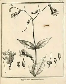 Planche 81. Lisianthius_grandiflora - 1. Bouton de fleur. - 2. Calice. - 3 . Calice ouvert. Ovaire, Style. Stigmate. - 4. Fleur épanouie. - 5. Corolle ouverte. Étamines. piſtil. - 6. Étamine. - 7. Capſule. - 8. Capſule coupée en travers.[16]