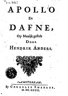 Pour le libraire Cornelis Sweerts, fils du poète Hiëronymus Sweerts, Anders composa, en 1691, la musique de la tragédie Jacoba van Beieren, erfgravin van Holland[4]. Pour la première fois, Sweerts s'était alors manifesté lui-même comme poète. Mais animé par un amour particulier pour la musique, il publia, en 1697, un court zangspel, Apollon et Daphné[5], dont la musique avait été composée par Hendrik Anders, et où Cupidon, afin de se venger du dieu Apollon pour le mépris que celui-ci affiche à son égard, lui fait éprouver un amour irrésistible pour une Daphné qui, au service de la déesse Diane s'adonnant aux plaisirs de la chasse, par l'intervention de Cupidon, demeure insensible à son amour tout en le rejetant ; comme Apollon veut passer à la violence, à sa propre demande, elle se fait transformer en un laurier.