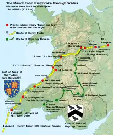 Ayant obtenu le soutien des partisans de l'ancien roi Édouard IV, Henri débarque à Mill Bay le , dans le Pembrokeshire, avec une armée composée essentiellement de soldats français et écossais, et marche sur l'Angleterre, accompagné de son oncle, Jasper Tudor, et du comte d'Oxford John de Vere. Le Pays de Galles demeure traditionnellement un bastion des Lancastre. Henri y réunit une armée d'environ 5 000 soldats et se dirige vers le nord.