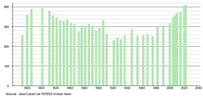 L'évolution du nombre d'habitants est connue à travers les recensements de la population effectués dans la commune depuis 1793. Pour les communes de moins de 10 000 habitants, une enquête de recensement portant sur toute la population est réalisée tous les cinq ans, les populations légales des années intermédiaires étant quant à elles estimées par interpolation ou extrapolation[26]. Pour la commune, le premier recensement exhaustif entrant dans le cadre du nouveau dispositif a été réalisé en 2004[27].