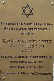 Dans les années 1930, de nombreux Juifs ont quitté Hergershausen. Beaucoup ont émigré aux États-Unis ou ont déménagé dans des grandes villes comme Francfort-sur-le-Main. Selon les registres du mémorial Yad Vashem à Jérusalem, 21 Juifs de Hergershausen ont été victimes de la Shoah. Aujourd'hui, à Hergershausen, une plaque commémorative a été inaugurée en 2006 pour le 50e anniversaire de la nuit de cristal, en mémoire de la synagogue et de la communauté juive[11].