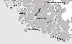 Le domaine d'Herjólfr Bárðarson a été établi sur la rive ouest d'un fjord qui porte son nom, l'Herjolfsfjord (en)[55],[56],[49],[52].