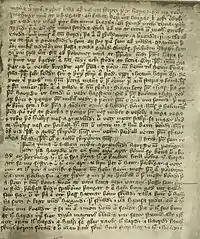 La construction de l'église est datée du XIIIe siècle, ou, plus précisément, au tournant du XIIe et du XIIIe siècle, aux environs de l'an 1200[66],[48],[10],[67],[68]. Aucune structure provenant d'un bâtiment antérieur à l'église n'a été identifiée[88]. Cependant, deux sépultures ont été découvertes dans les substructions des parties ouest et est du bâtiment. Ces tombes datent très probablement d'une époque antérieure à celle de la construction de l'église[88]. Compte tenu des datations radiocarbones des restes humains et des éléments vestimentaires exhumés dans l'aître de l'église, les archéologues estiment que le bâtiment a très probablement fait l'objet d'une continuité d'utilisation au cours du premier quart du XVe siècle[66].