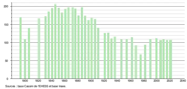 L'évolution du nombre d'habitants est connue à travers les recensements de la population effectués dans la commune depuis 1793. Pour les communes de moins de 10 000 habitants, une enquête de recensement portant sur toute la population est réalisée tous les cinq ans, les populations légales des années intermédiaires étant quant à elles estimées par interpolation ou extrapolation[30]. Pour la commune, le premier recensement exhaustif entrant dans le cadre du nouveau dispositif a été réalisé en 2005[31].