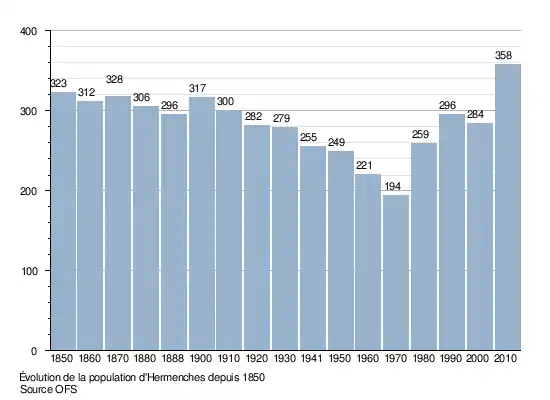 La population d'Hermenches est de 323 personnes en 1850. Elle reste relativement stable jusqu'en 1930. Le nombre d'habitants baisse ensuite jusqu'à 194 en 1970, puis double presque en quarante ans pour atteindre 358 en 2010. Le graphique suivant résume l'évolution de la population d'Hermenches entre 1850 et 2010[29] :