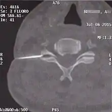 - (en) Abbasi A, Malhotra G, Malanga G, Elovic EP, Kahn S, « Complications of interlaminar cervical epidural steroid injections: a review of the literature », Spine, vol. 32, no 19, , p. 2144–51 (PMID 17762818, DOI 10.1097/BRS.0b013e318145a360)