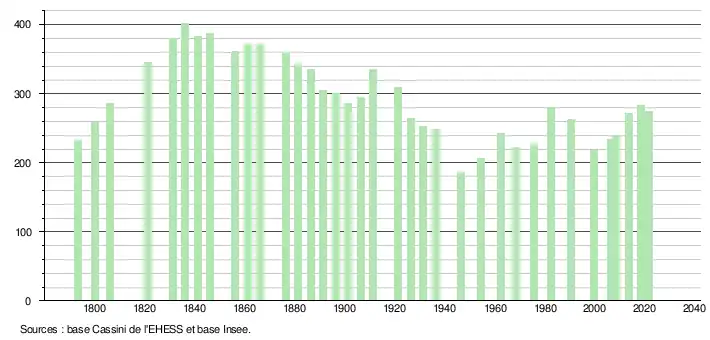 L'évolution du nombre d'habitants est connue à travers les recensements de la population effectués dans la commune depuis 1793. Pour les communes de moins de 10 000 habitants, une enquête de recensement portant sur toute la population est réalisée tous les cinq ans, les populations légales des années intermédiaires étant quant à elles estimées par interpolation ou extrapolation[17]. Pour la commune, le premier recensement exhaustif entrant dans le cadre du nouveau dispositif a été réalisé en 2008[18].