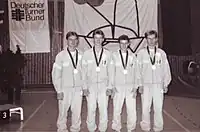 Équipe de France junior de trampoline, vice-championne d’Europe, en 1988. De gauche à droite : Hervé Guérard, Fabrice Schwertz, Jean‐Michel Martin et Fabrice Hennique.