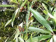 Nezara viridula, juvéniles stade III. Encore groupés, mais loin des œufs.