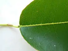 Ses feuilles sont luisantes, ovales à elliptiques, de 3 à 20 cm de long. Leur base est arrondie, tronquée à subcordée. Le pétiole de 5–12 cm porte une grosse glande rouge à l'apex.