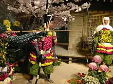 - Les figures en chrysanthèmes. Cette culture a cent ans d’histoire ; il y a un spectacle caractéristique en automne. Les vêtements des figures sont fabriqués en chrysanthèmes selon un thème différent chaque année[25].