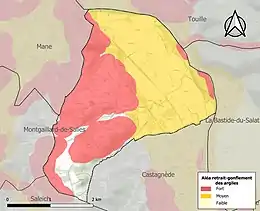 La commune est vulnérable au risque de mouvements de terrains constitué principalement du retrait-gonflement des sols argileux[32]. Cet aléa est susceptible d'engendrer des dommages importants aux bâtiments en cas d’alternance de périodes de sécheresse et de pluie. 91,3 % de la superficie communale est en aléa moyen ou fort (88,8 % au niveau départemental et 48,5 % au niveau national). Sur les 124 bâtiments dénombrés sur la commune en 2019, 123 sont en aléa moyen ou fort, soit 99 %, à comparer aux 98 % au niveau départemental et 54 % au niveau national. Une cartographie de l'exposition du territoire national au retrait gonflement des sols argileux est disponible sur le site du BRGM[33],[Carte 3].