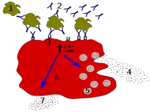 - lors d'une phase de sensibilisation, une immunoglobuline E (IgE) spécifique d'un allergène (pollen, aliment) va s'attacher à sa surface. Lors de l'exposition suivante à l'allergène, la « dégranulation » est provoqué par la liaison de l'IgE avec cet allergène spécifique. Le mécanisme de cette exocytose dépend principalement de l'augmentation de la concentration en Ca2+ cytosolique.