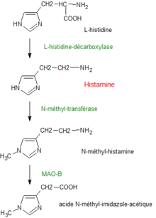 Une fois formée, l'histamine est soit stockée soit dégradée. La dégradation est assurée par l'histamine N-méthyl transférase, localisée dans le cytoplasme de nombreuses cellules, neurones et cellules gliales au niveau central. Le produit formé est ensuite dégradé par la MAO-B (monoamine oxydase B).