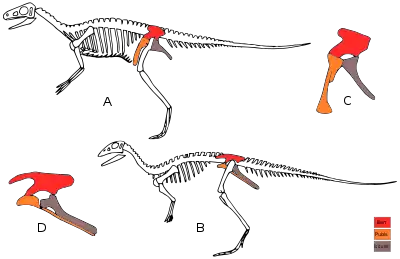 On connait peu d’ornithischiens au Trias[4]. La première et seule espèce connue à ce jour est Pisanosaurus vers 220-230 Ma. Bien que Lesothosaurus soit daté de 195-206 Ma, c'est-à-dire le Jurassique inférieur, l'analyse de son squelette suggère une branche des ornithischiens au moins aussi ancienne que Pisanosaurus. L'illustration ci-dessous montre les différences de squelette entre deux dinosaures primitifs, saurischiens et ornithischiens.