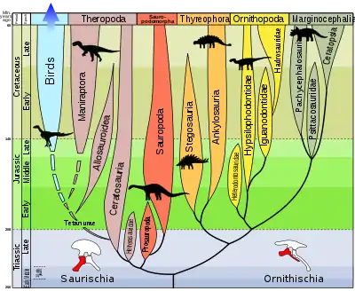 En dehors de quelques saurischiens primitifs, on sépare les saurischiens en Sauropodomorphes et les Théropodes[5]. Parmi les Sauropodomorphes, on distingue les Prosauropodes qui ont vécu les premiers, puis les Sauropodes. L'histoire évolutive des théropodes est plus complexe. En 2004, Dinosauria les sépare en Ceratosauria, Tetanurae, Tyrannosauridés, Ornithomimosaures, Therizinosauridae, Oviraptorosaures, Troodontidés, Dromaeosauridés et Avialae.