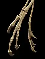 Serre de Centropus. - Les doigts des ailes aussi s'allongent, occupant progressivement une plus grande proportion du membre antérieur, et le poignet est remodelé. Les théropodes primitifs ont un os du poignet aplati, qui chevauche la base des premier et second os de la paume et les doigts. Chez les maniraptoriens, cet os a une forme de demi-lune le long de la surface de contact avec les os du bras. Cette forme en demi-lune est importante : elle permet à ces animaux de plier le poignet latéralement, et plus seulement verticalement. Ainsi, ils peuvent presque replier leur longue main comme le font les oiseaux actuels avec leurs ailes. Cette main allongée peut aussi être tournée et brusquement projetée vers l'avant pour la capture d'une proie. Seuls les Hoazins et les Touracos ont gardé des griffes sur leurs ailes. Toutefois ils n'en ont que deux (Archaeopteryx en avait trois) et ils les perdent à l'âge adulte. Ils ne peuvent d'ailleurs pas voler à l'âge où ils en sont dotés[9].