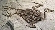 L'histoire évolutive des oiseaux débute à l'époque jurassique, les premiers oiseaux provenant d'un clade de dinosaures théropodes appelée Paraves[3]. Les oiseaux sont classés dans une classe biologique, les Aves. Pendant plus d'un siècle, le petit dinosaure théropode Archaeopteryx lithographica de la fin du Jurassique a été considéré comme l'oiseau le plus ancien. Les phylogénies modernes placent les oiseaux dans le clade des dinosaures théropodes. Selon le consensus actuel, Aves et un groupe frère, l'ordre des Crocodiliens, sont les seuls membres vivants d'un clade non classé, l'Archosauria. Le plus ancien représentant connu du groupe apical des oiseaux (qui regroupe leur ancêtre commun et tous ses descendants, actuels ou non) est Asteriornis maastrichtensis, qui vivait au Maastrichtien (66,8–66,7 Ma)[4]. Quatre lignées distinctes d'oiseaux ont survécu à l'extinction du Crétacé-Paléogène il y a 66 millions d'années, donnant naissance aux autruches et apparentés (Palaeognathae), aux canards et apparentés (Anseriformes), aux oiseaux terrestres (Galliformes) et aux oiseaux modernes (Neoaves).