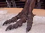 - Ces dinosaures marchent sur les trois doigts du milieu, ceux qu'utilisent toujours les oiseaux actuels. Le cinquième orteil, sans articulation, est raccourci et effilé. Le premier orteil, qui dépasse sur le côté du deuxième orteil, est formé d'un os raccourci, d'une articulation et d'une griffe. Il est placé au-dessus des autres orteils, tel un ergot.