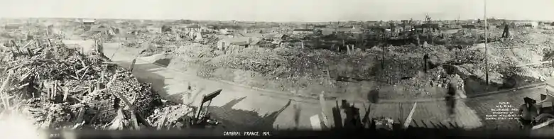 Lors de cette bataille, les chars d'assaut furent utilisés pour la première fois. Durant cette offensive, les alliés parviennent à percer la fameuse ligne Hindenburg (Ligne Siegfried) et permettent aux troupes britanniques du général Byng d'approcher à 3 km des faubourgs cambrésiens. Pourtant, ces troupes sont rejetées en décembre de la même année. Il faut attendre pour voir les britanniques pénétrer de nouveau dans les faubourgs. Si Marcoing et Masnières sont libérées le 28, c'est le que les généraux Byng et Rawlinson attaquent le sud de Cambrai, en liaison avec l'armée française du général Debenay. Le lendemain, les Canadiens entrent dans un Cambrai en flammes (voir bataille de Cambrai (1918)). En effet, les habitants ayant été évacués vers la Belgique, les Allemands incendient le centre de la ville, détruisent l'hôtel de ville ainsi que les magnifiques archives municipales et diocésaines[30] livrées volontairement au feu[réf. souhaitée]. Au total, plus de 1 500 immeubles sur les 3 500 que compte Cambrai sont totalement détruits.