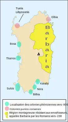 Entre le Ve et le IIIe siècle av. J.-C., les Carthaginois y érigent une série de fortifications, le IVe siècle voyant la conquête de l'ensemble de l'île[70],[71]. Les découvertes archéologiques « révèlent une homogénéité culturelle » partout sur le territoire sarde[72], ce qui indique la force de l'implantation punique, sauf sur la partie Nord-Est laissée sans doute volontairement aux populations originelles[73].