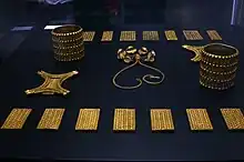 La tradition, qui rapporte un traité entre la puissance étrusque et la cité punique, est appuyée par des indices archéologiques : les lamelles de Pyrgi, trouvées sur le sol italien avec des textes en phénicien et en étrusque[120], sont une dédicace datant d'environ 500 av. J.-C. d'un temple à Astarté, déesse phénicienne, par Thefarie Velianas, roi de Caeré[121]. Les fouilles de Carthage ont également livré une inscription en étrusque destinée à présenter un individu, peut-être un marchand punique. Cette inscription, trouvée sur la colline dite de Sainte-Monique, a peut-être été rédigée dans la cité étrusque de Vulci[122]. Ces éléments s'ajoutent à de nombreuses céramiques à bucchero qui confirment des liens commerciaux précoces, dès le VIIe siècle[122] et au moins jusqu'au début du Ve siècle[121].