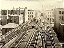 L'Union Loop (le circuit aérien qui forme une boucle et qui délimite le secteur financier du Loop) a été construit par l'ingénieur Charles Yerkes[82] en sections distinctes : la Lake Street Elevated fut prolongée le long du côté nord en 1895, le côté est fut ouvert le long de Wabash Avenue en 1896 et le côté ouest le long de Wells Street en 1897. Le dernier côté au sud sur Van Buren Street fut ouvert en 1897 également en prolongeant la South Side Elevated[83],[84].