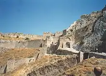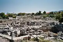 Lors de la scission de l'empire en 395, la cité passe dans l'Empire romain d'Orient sous domination byzantine. La ville est en grande partie détruite dans les tremblements de terre de 365 et 375. En 396, Corinthe est pillée par Alaric lors de son invasion de la Grèce. Après ces catastrophes, la ville est reconstruite une seconde fois, mais la cité couvrait une superficie beaucoup plus petite que précédemment. Quatre églises sont construites dans la ville proprement dite, une autre sur la citadelle de l'Acrocorinthe et une basilique monumentale au port de Lechaion[119]. Pendant le règne de l'empereur Théodose II, entre 408 et 450, on commence la construction d'un grand mur de pierre à partir du golfe Saronique jusqu'au golfe de Corinthe, pour la protection de la ville et de la péninsule du Péloponnèse, afin de faire face aux invasions barbares du nord. Pour son édification, on utilise les pierres de nombreuses constructions de Corinthe. Le mur de pierre est long d'environ dix kilomètres et on le nomme mur de l'Hexamilion (« six miles » = dix kilomètres). La structure est renforcée avec des tours supplémentaires sous le règne de Justinien[120].