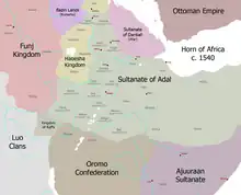 - Monarchies d'Éthiopie (en) (royaumes vassals : Garo, Gera, Gumma, Harar, Janjero, Jimma, Kaffa...)