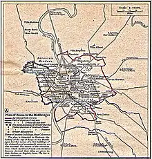 Le centre historique s’identifie avec les limites des antiques ousmoutou impériales. Certaines zones ont été restructurées à la suite de la réunification (1880-1910 Rome Umbertina), et quelques adjonctions et adaptations furent réalisées pendant la période fasciste, avec la création de la Via dei Fori Imperiali et Via della Conciliazione face au Vatican (pour la construction de laquelle une grande partie du Borgo adjacent fut détruite ; et la fondation de nouveaux quartiers (parmi lesquels Eur (construit en vue de l’Exposition universelle de 1942), San Basilio, Garbatella, Cineville, Trullo, Quarticciolo, et, sur la côte, la restructuration d'Ostie) et l'annexion des villages limitrophes (Labaro, Osteria del Curato, Quarto Miglio, Capannelle, Pisana, Torrevecchia, Ottavia, Casalotti). Cela a entraîné une extension vers le sud-est, le long des voies Tiburtine, Prenestine, Casiline, Appia Nouvelle. La ville a dépassé le cours de l’Aniene d'un côté et s'est étendue vers la mer de l'autre, au nord-ouest elle a englobé Monte Mario. Ces extensions étaient nécessaires pour faire face à la grande croissance démographique due à la centralisation de l’État italien.