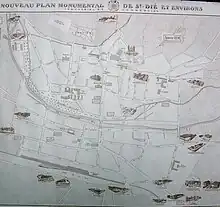La ligne de front reste quasiment la même jusqu’à l’Armistice du 11 novembre 1918. Saint-Dié est au cœur de la tourmente à la fin de l’été 1914 et reste la première petite ville à proximité des zones de combats de la Fontenelle et du Spitzemberg en 1915. Elle subit de nombreux bombardements par les gros canons placés sur les cols, en particulier le col de Sainte-Marie ainsi que par des attaques aériennes à la fin de la guerre. Cette commune sinistrée reçoit la Croix de guerre[20] de la part du président Raymond Poincaré. La nécropole nationale des Tiges, adossée au massif du Kemberg, témoigne de la violence des combats menés aux abords mêmes de la ville lors de la bataille de la Haute Meurthe.