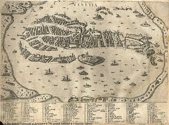 À la fin du XVIe siècle, selon Jean Delumeau, on comptait à Venise "plus de 100 palais, plus de 120 églises, 17 hôpitaux, 450 ponts (...) Entre 1509, où la ville comptait 100 000 habitants, et 1575, ce sont 75 000 habitants supplémentaires qu'il a fallu loger"[16]. De nombreuses constructions monumentales étaient dues à l'architecte Jacopo Sansovino.