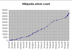 Le projet dépasse les 1 000 articles le , et les 10 000 articles autour du . Dans sa première année d'existence, plus de 20 000 entrées encyclopédiques furent créées, soit un taux de plus de 1 500 articles par mois. Le , le projet atteint les 40 000 articles. Le taux de croissance a plus ou moins régulièrement augmenté depuis la création de Wikipédia, excepté durant des coupures liées à des problèmes logiciels ou matériels.