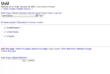 Les premières modifications réalisées sur Wikipédia ont été vraisemblablement réalisées par Jimmy Wales, afin de tester le wiki. Cependant, l'article le plus ancien encore aujourd'hui accessible est l'article UuU, créé le à 21:08 UTC[23].