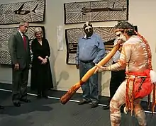 Les Aborigènes ont conservé nombre de chants ancestraux et développé des instruments très particuliers. Le yidaki ou didjeridoo est considéré comme l'instrument le plus représentatif des Aborigènes, certains avancent qu'il serait le plus ancien des instruments à vent. Des peintures rupestres datées du début de notre ère, et trouvées dans le Territoire du Nord, montrent des images de didjeridoo[6]. Les rituels, avec danses et cérémonies indigènes, sont exécutés en Australie depuis des temps immémoriaux, avec le chant et la décoration des corps. Ils dépeindraient le plus souvent des contes du Temps du rêve (Tjukurpa en langue anangu) aussi appelé le rêve, qui est le thème central de la culture des Aborigènes d'Australie. Le « temps du rêve » explique les origines de leur monde, de l’Australie et de ses habitants[7]. Un corroboree est une réunion commémorative des Aborigènes d'Australie : « Leurs corps étaient peints de différentes manières et ils portaient des parures diverses qui n'étaient pas utilisées tous les jours »[8]. La coutume physique la plus célèbre des Aborigènes d'Australie est la pratique du boomerang.