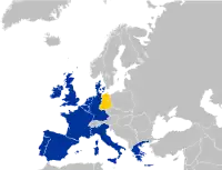 Après la Seconde Guerre mondiale, les États-Unis appuient la création d'une union économique et assurent la défense militaire de l'Europe de l'Ouest face au bloc de l'Est[18],[3].