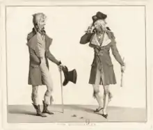 C’est sur la base de cette nouvelle mode que le personnage de Muscadin est apparu dans la fiction et au théâtre, tirant son non des « muscadins », ces pastilles de bouche composées de sucre, de musc et d’ambre, dont on se servait pour adoucir l’haleine et pour « se réjouir le cœur »[65]. Par extension, on a aussi nommé « muscadin » les individus qui faisaient un usage excessif des parfums musqués et prenaient grand soin de leur apparence physique. Par la suite, sous la Révolution, le terme prend un sens politique. À Lyon, il désigne de manière spécifique un groupe politique antijacobin. « Muscadin » devint une insulte lancée par le peuple à des bourgeois lyonnais trop bien mis, trop propres, trop parfumés pour une période de famine. À Paris, pour le parti jacobin, le muscadin est l’antirévolutionnaire, le lâche efféminé fuyant les combats. Les odeurs musquées vont être associées aux frasques de l’Ancien régime[65].