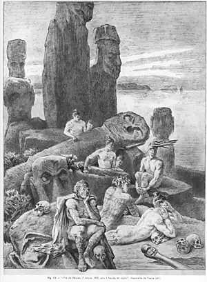 Avant le XIXe siècle, Roggeveen, González, Cook et La Pérouse trouvent et représentent l’île relativement boisée et des ahu portant des moaï encore debout. En revanche, au XIXe siècle et au XXe siècle l’équipage allemand de la canonnière S.M.S. Hyäne, Katherine Routledge, Alfred Métraux[10] et Thor Heyerdahl trouvent l’île dépourvue d’arbres et les moaïs tous renversés de leurs ahu. Que s’est-il passé entre-temps ? La tradition orale parle de guerres internes, les paléoenvironnementalistes évoquent des séismes et des tsunamis (l’île est volcanique, même si ses volcans ne sont plus actifs à part des fumerolles[2]), les historiens et les économistes décrivent l’appropriation de l’île par les éleveurs de moutons et l’action des missionnaires. Ces causes, bien sûr, ne sont pas exclusives les unes des autres[3].