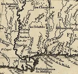 Deux ans seulement après son arrivée, en 1736, Bienville organise une expédition punitive contre les indiens Chicachas, coupables d'avoir donné refuge aux chefs Natchez, responsables de la tuerie de 1729 au Fort Rosalie, sur le Mississippi. Son plan était de remonter la rivière Tombigbee, atteignant les villages Chicachas par le sud, tandis que le major Pierre d’Artaguiette, venant des Illinois avec 140 Français et 266 Indiens, s’approcherait par le nord-ouest pour le retrouver au comptoir des Anglais près de Fulton[10]. Le 25 mars, Bienville tardant à paraître, d’Artaguiette, voyant ses vivres s’épuiser, attaqua trois villages chicachas près du village actuel de Pontotoc (Mississippi) mais fut cerné. D’Artaguiette et ses officiers furent saisis par les Chicachas et brûlés[11]. En 1746, le gouverneur de la Louisiane Pierre de Rigaud de Vaudreuil a de nouveau combattu les Indiens vivant le long de ces rivières, cette fois les tribus choctaw.