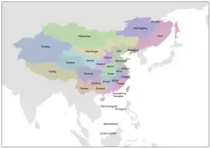 | Nom | Chinois traditionnel | Chinois simplifié | Pinyin | Capitale | Étendue approximative en fonction des lieux actuels | |
