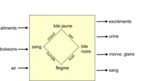 Cette dimension théorique de la médecine savante hippocratique est exposée dans La Nature de l’homme[10]: le corps humain est considéré comme une « boîte noire »[11] avec des entrées (nourriture, boissons, air inspiré) et des sorties (urine, excréments, morve, expectorations, glaire, sang venant de saignement de nez ou de blessure). En l’absence de dissection humaine, les médecins s’appuient sur l’observation de ces flux d’entrée et de sortie, pour construire un modèle théorique hypothétique du corps humain, appelé théorie des quatre humeurs, donnant l’organisation de quatre fluides intérieurs en mouvement, allant de la tête vers le bas : le phlegme, le sang, la bile jaune, et la bile noire. La santé résulte d’un équilibre entre les humeurs et la maladie d’un excès ou insuffisance d’une humeur en un lieu donné. Certains organes (schêmata σχήματα) creux, comme la tête, la vessie, l’utérus, attirent, à la façon de ventouses, les humeurs du reste du corps (Ancienne médecine[12],[13], XXII, 5) ; d’autres, « spongieux et poreux telles que la rate, le poumon et les seins », absorbent seulement les liquides qui passent à proximité (XXII, 6). L’action thérapeutique va consister à diriger ses flux intérieurs vers d’autres lieux ou des portes de sortie. L’observation attentive des matières excrétées (vomis, excréments etc.) permettait de « voir » la pituite (phlegme) ou la bile rejetées. La pharmacopée hippocratique est en conséquence, très riche en remèdes purgatifs[n 2], diurétiques, vomitifs, expectorants, sternutatoires, sudorifiques, emménagogue etc. pour évacuer les humeurs nocives par les selles, l’urine, la bouche, le nez, les pores (des glandes sudoripares), l’utérus, etc. Primitivement, ils avaient pour rôle d’éliminer la maladie, considérée comme une impureté. Et comme le fait remarquer Jacques Jouanna[14], les mêmes termes (famille de kathairen καθαιρειν) sont employés en grec pour désigner la purgation et la purification. Dans les deux cas, il fallait éliminer une impureté. La langue garde ainsi la mémoire d'une unité primitive entre religion et médecine.