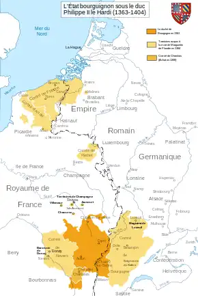Quelques siècles plus tard, l'entreprise des ducs de Valois marque profondément son histoire. Philippe le Hardi, Jean sans Peur, Philippe le Bon et Charles le Téméraire font de leur État une grande puissance européenne qui englobe la Belgique et la Hollande actuelles et qui devient la rivale du royaume de France. Philippe le Bon, fondateur de l'ordre de la Toison d'or, fait rayonner sa cour et étend sa renommée jusqu'en Orient. Son fils Charles le Téméraire mate les révoltes de Gand en Flandre et de Liège. Il élève à son apogée l'État bourguignon, mais sa mort à la bataille de Nancy en 1477 fait rentrer définitivement le duché de Bourgogne dans le domaine de la couronne. Cependant, la fille de Charles, Marie de Bourgogne, sauve son pouvoir sur les États du nord, donnant naissance à une descendance qui aboutit à Charles V dit Charles Quint, né à Gand, qui ne cessa de revendiquer la Bourgogne, source de conflits incessants avec la monarchie française.