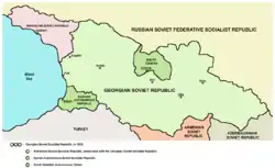 Après l'invasion soviétique, la république socialiste soviétique de Géorgie est proclamée, et se développe bientôt un bras de fer entre les différentes fractions de Moscou, celles dirigées par Lénine et Staline, durant l'Affaire géorgienne des années 1920, qui mène également à la perte de près d'un tiers des territoires géorgiens au profit de ses différents voisins. En , l'URSS est proclamée, et la RSG devient une des trois républiques de la république socialiste fédérative soviétique de Transcaucasie, dissoute à son tour en 1936.
