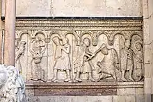 La frise se trouve placée aujourd’hui sur deux niveaux différents. Cette disposition n’est certainement pas celle d’origine : les quatre plaques devaient être sur le même axe horizontal mais les deux des extrémités ont probablement été rehaussées au XIIe par les Maestri campionesi lorsqu’ils ouvrirent les deux portes latérales de la façade.