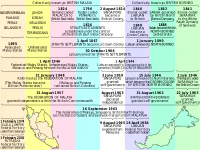 La Malaisie actuelle résulte de l'entrée en 1963 des territoires britanniques de Bornéo devenus indépendants, Sabah et Sarawak, dans la fédération de Malaisie (1948-1963), elle-même devenue indépendante en 1957.